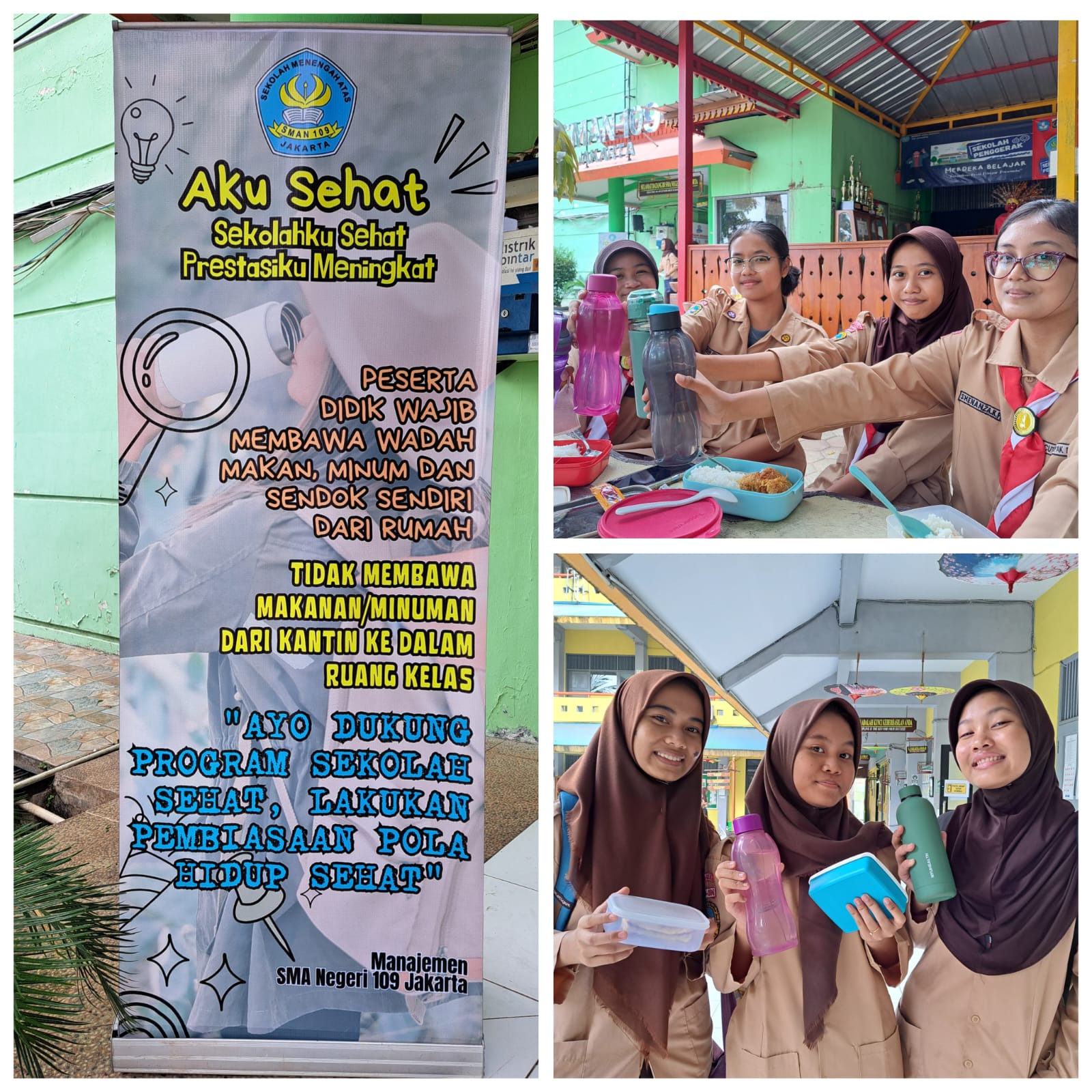 SMAN 109 Jakarta (10/10/2023) "Siap" mendukung program Sekolah Sehat yang dicanangkan oleh Kemendikbudristek sebagai sebuah upaya untuk terwujudnya sekolah yang sehat dan mengoptimalkan prestasi sekolah. Kali ini program tersebut berupa gerakan membawa wadah makan dan botol minum sendiri yang telah diberlakukan untuk para peserta didik, pendidik dan tenaga kependidikan. Sehingga pihak kentin tidak perlu lagi menjual air mineral kemasan gelas atau botol plastik. Air mineral bisa dijual dengan menggunakan galon dispenser. Dengan begitu, sampah plastik di sekolah akan berkurang.
