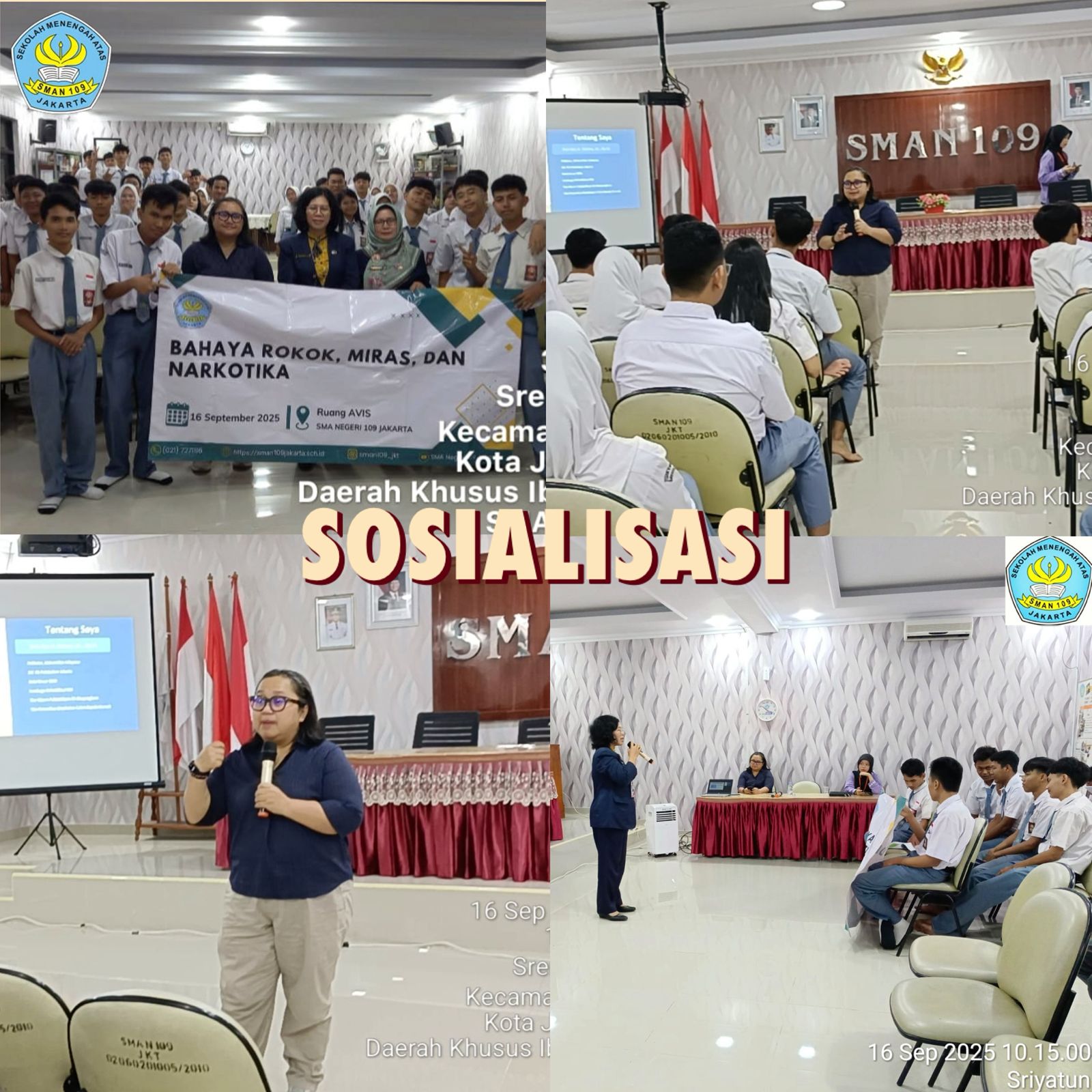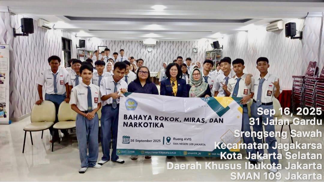 MAN 109 Jakarta (22 September 2025) melaksanakan kegiatan Sosialisasi Bahaya Rokok, Miras dan Narkotika. Kegiatan ini diselenggarakan pihak sekolah dalam rangka memberikan penguatan dalam rangka meningkatkan kesadaran, pengetahuan dan kepedulian warga sekolah dan masyarakat dalam hal ini orang tua terhadap bahaya Rokok, Miras dan Narkotika.