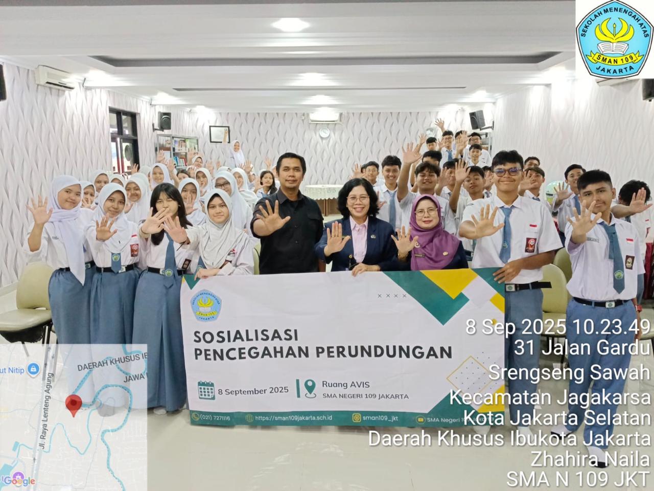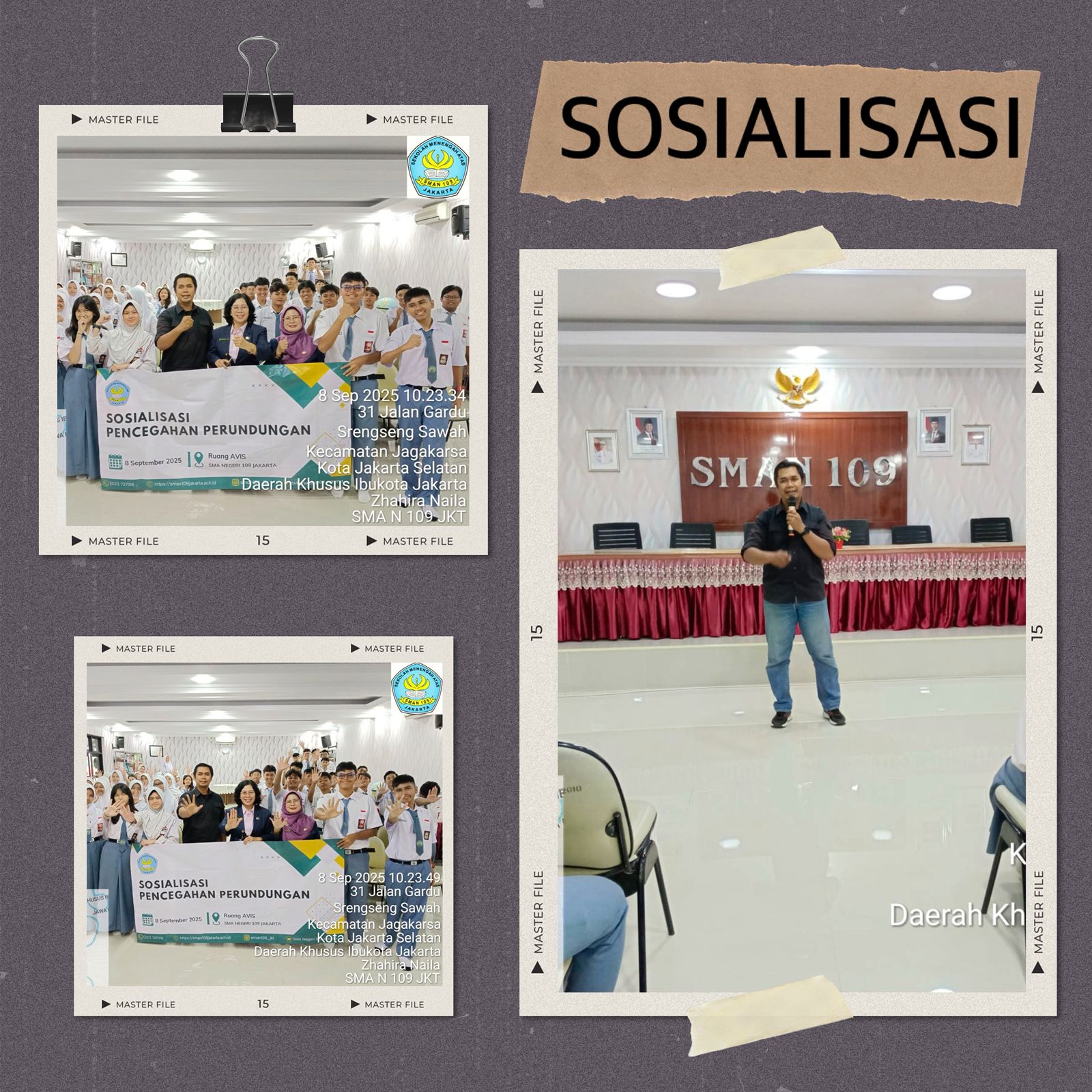SMAN 109 Jakarta (8 September 2025) melaksanakan kegiatan Sosialisasi Pencegahan Perundungan. Kegiatan ini diselenggarakan pihak sekolah dalam rangka memberikan penguatan dalam rangka meningkatkan pemahaman tentang perundungan, pencegahan dan menumbuhkan sikap empati dan toleransi serta mendorong peran aktif warga sekolah dan masyarakat dalam hal ini orang tua.